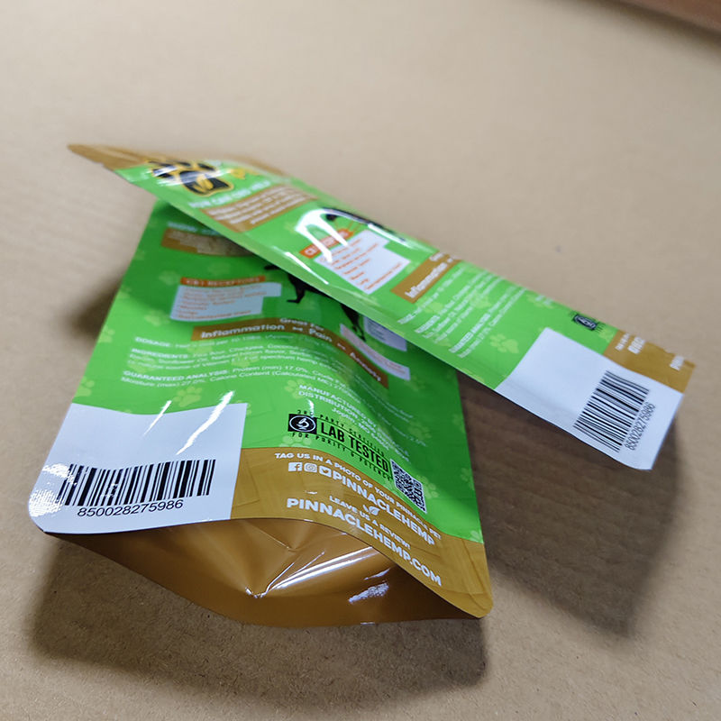 | Résistance à la perforation | Conception en stratifié renforcé | 7 Mil d'épaisseur + couche de PE reliée en croisement résiste aux chocs des bords tranchants de la nourriture pour animaux de compagnie (par exemple, des croquettes).Pour les appareils à commande numériqueessais d'impact (force de perforation de ≥ 16 lb) |